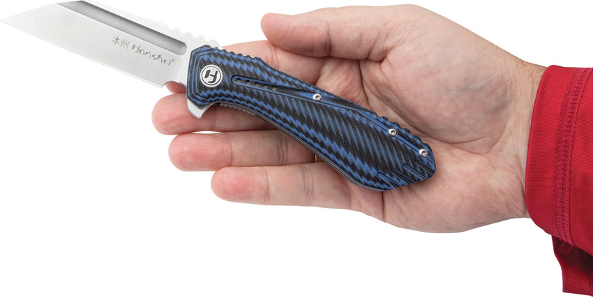 4.63″ (11.76cm) closed. 3.38″ (8.59cm) satin finish 7Cr17MoV stainless Wharncliffe blade. Black and blue G10 handle. Extended tang. Pocket clip. Boxed.