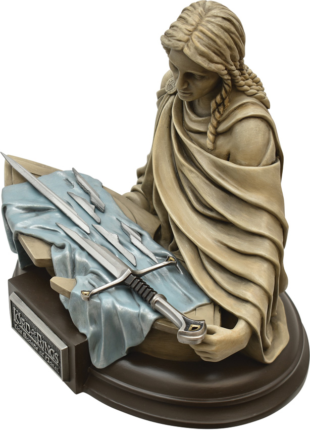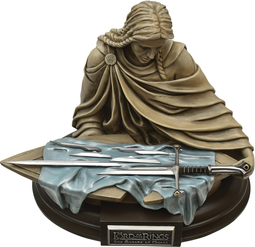 1/5 scale miniature Shards of Narsil are presented with a hand-painted cold cast polyresin statue of an Elven Princess cradling a shield that the removable shards lay upon. This updated true color version reflects the actual tan color of the stone statue and blue velvet cloth rather than the blue stone and silver cloth colors from the previous version. Boxed.