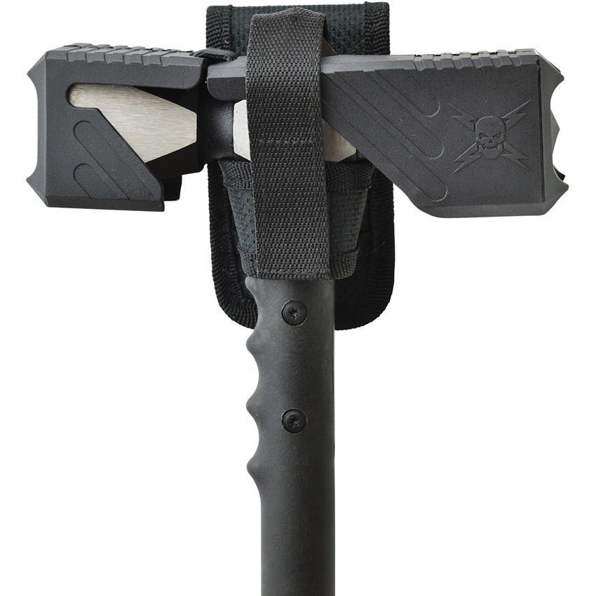38.5″ overall. Black oxide and satin finish 2Cr13 stainless double hammer head with skull crusher at it’s top and five penetrating points on each square head. Black injection molded nylon handle with reinforced fiberglass fill. TPR head cover with removable nylon belt loop. Boxed.