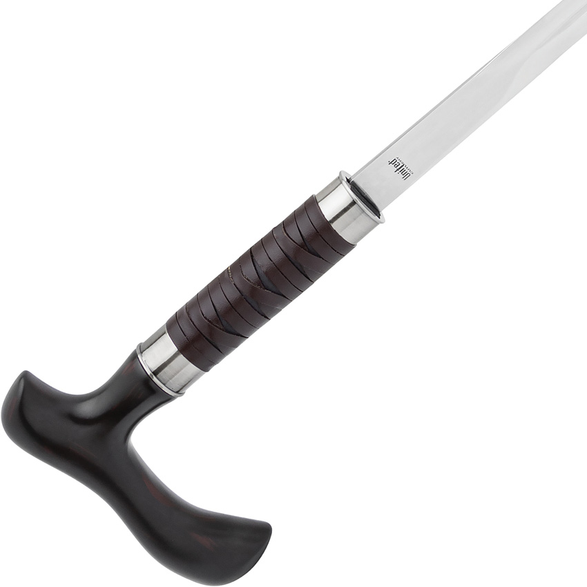 38.5″ (97.79cm) overall. 23″ (58.42cm) satin finish 1045 carbon steel blade. Hardwood hook cane handle with leather wrapped blade handle. Hidden blade release mechanism. Boxed.