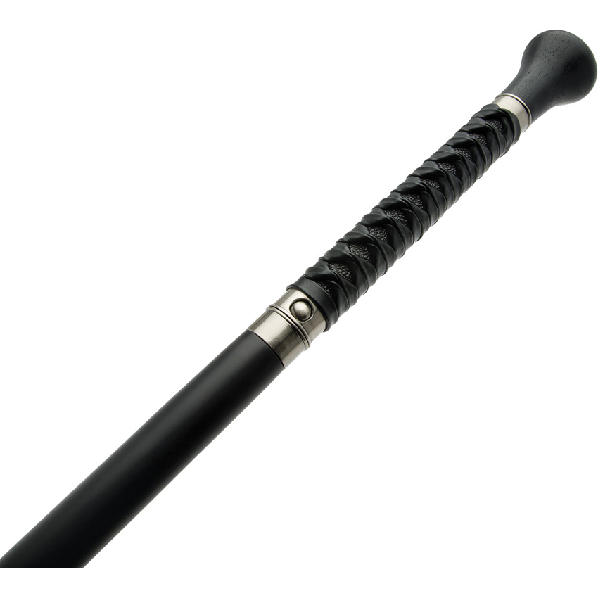 37.13″ (94.31cm) overall. 18.25″ (46.36cm) carbon steel blade. Blade that can be pulled from the shaft with integrated release button. Black wooden knob handle with leather-wrapped grip above a wooden shaft with a rubber toe. Boxed.
