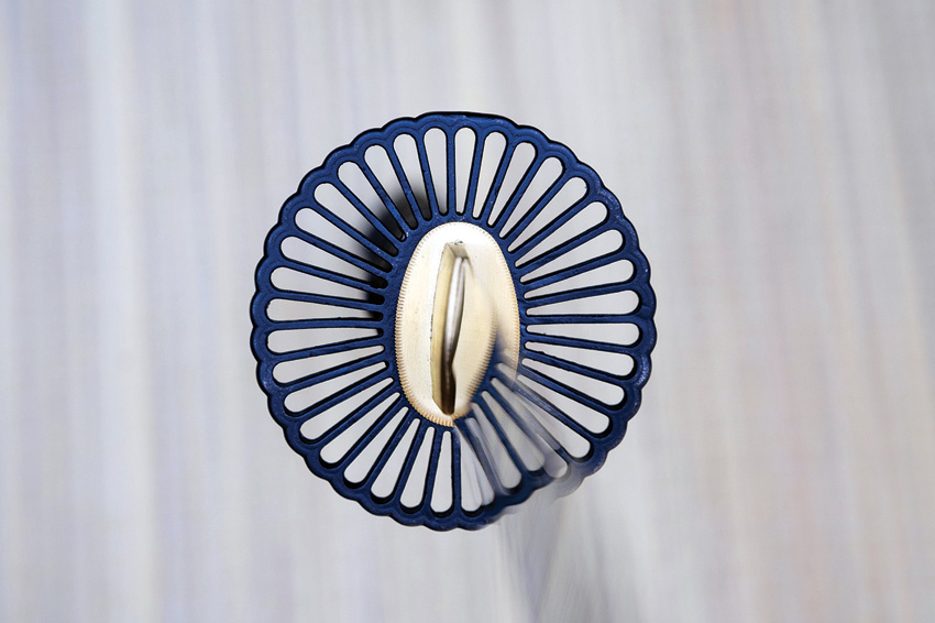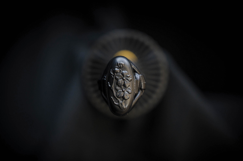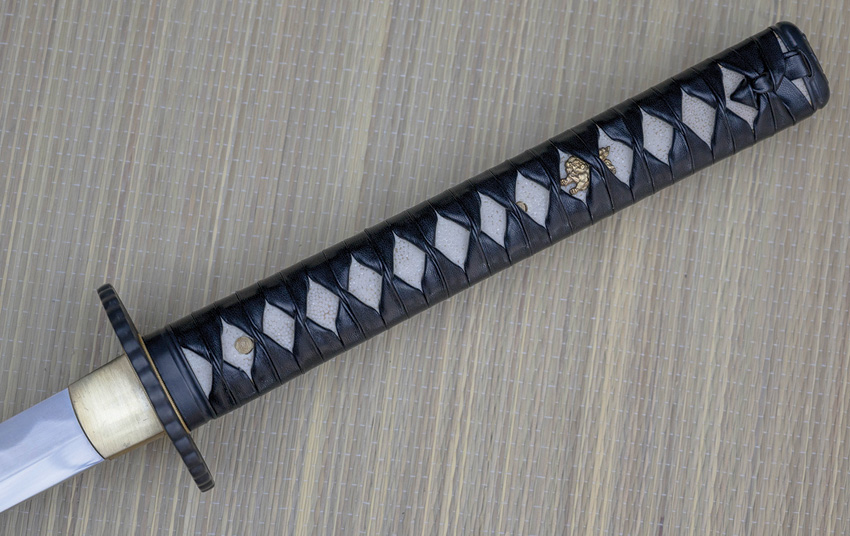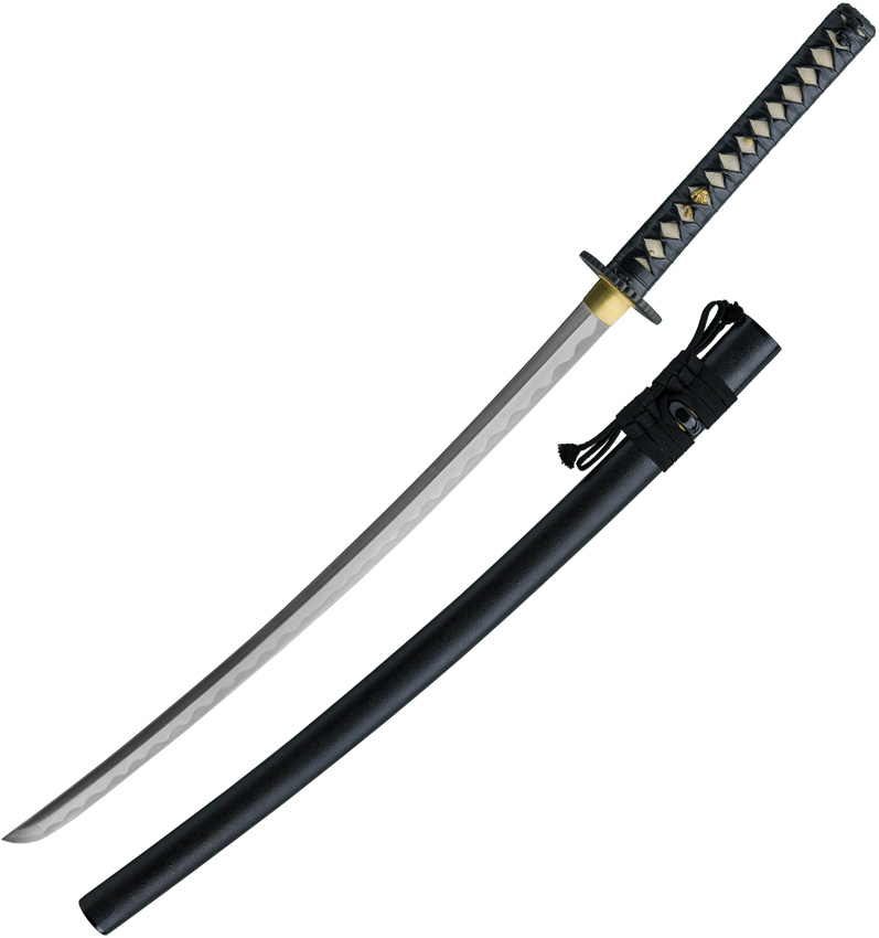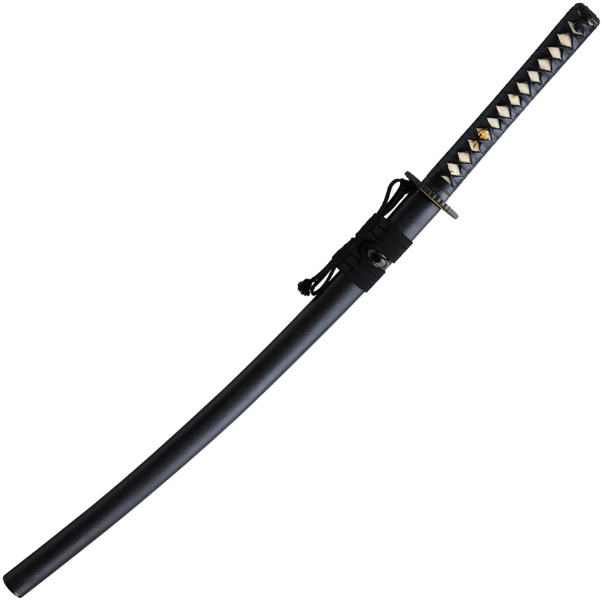 39.5″ (100.33cm) overall. 27″ (68.58cm) blade. Weight: 2.2lb. Differential tempered 1566 high carbon forged blade. Fittings are decorated in a Japanese Dogwood motif with dragon menuki and the handsome tsuba is of an iron sunburst” design with a brass habaki. Black wood scabbard. Boxed.