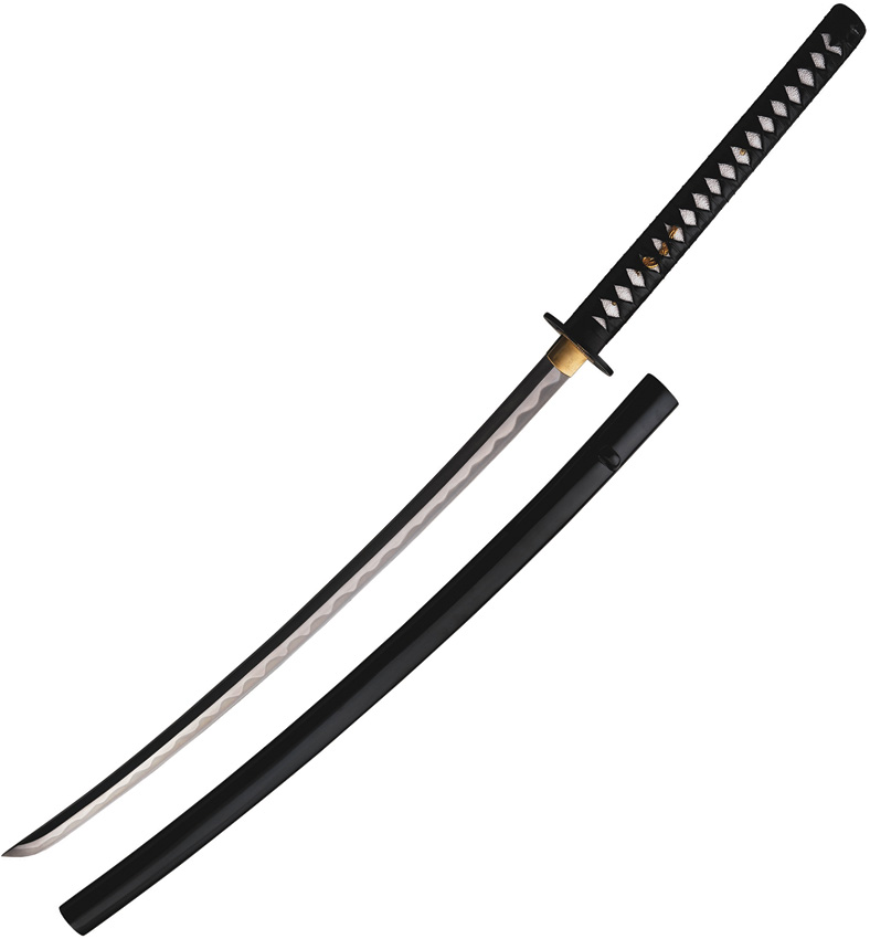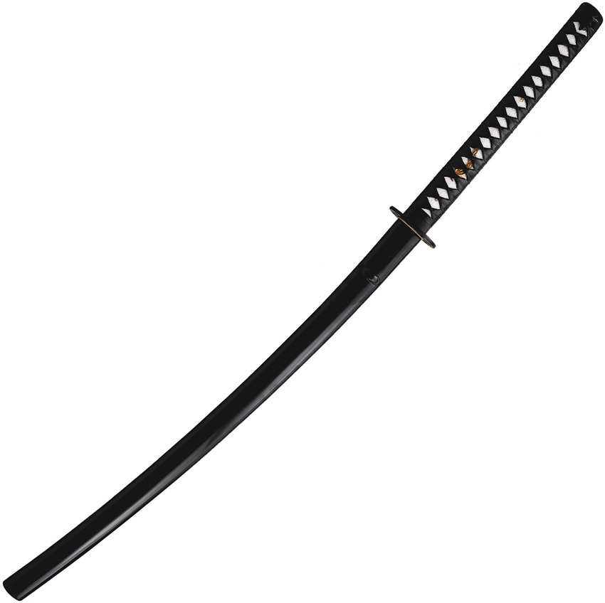 45.75″ (116.21cm) overall. 29.5″ (74.93cm) forged blade. Weight: 3lb. 1566 high carbon steel blade. Differentially tempered. Fully functional. Golden menuki contrast brightly against the white same (rayskin) and black tsuka-ito. The saya is finished in a deep black lacquer with a black cotton sageo. Round Kuruma tsuba represents the Wheel of Dharma”. Boxed.