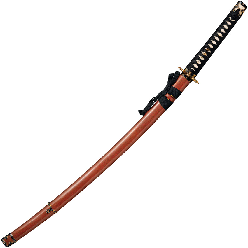 40.5″ (102.87cm) closed. 30″ (76.2cm) Damascus steel blade. Blade has been given a differentially hardened, heat treatment to create a clay tempered Hamon. Brass Tsuba. Black silk cord wrapped hardwood handle with Same insert and Menuki. Brown wood scabbard. Boxed.
