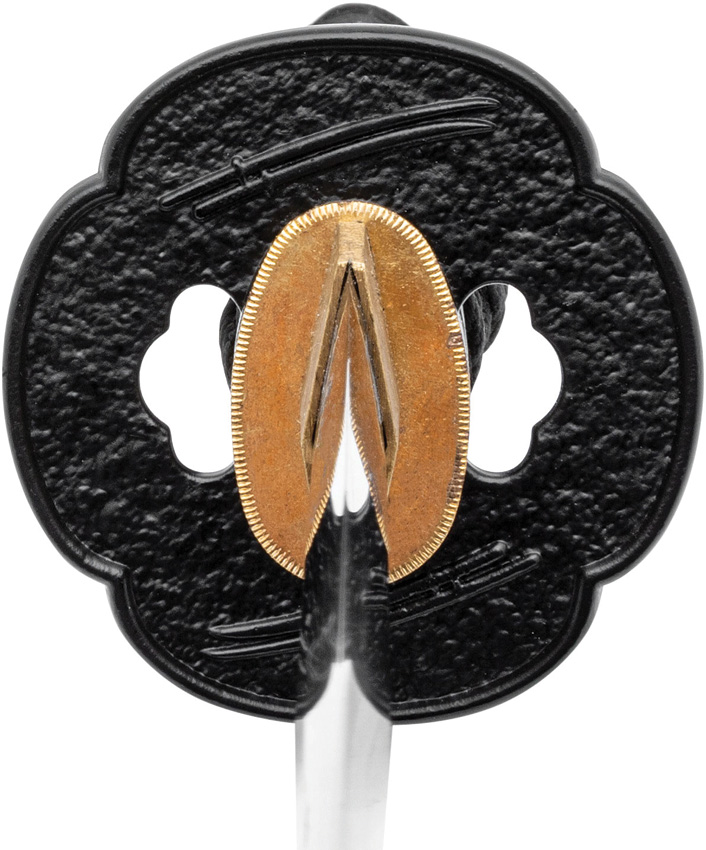 41.5″ (105.41cm) overall. 29″ (73.66cm) double edge T10 High-Speed Tool Steel blade. Brass habaki. Black metal tsuba with embossed design. Cream-colored rayskin and black cord wrapped handle with black and brass dragon menuki. Black wood scabbard. Boxed.