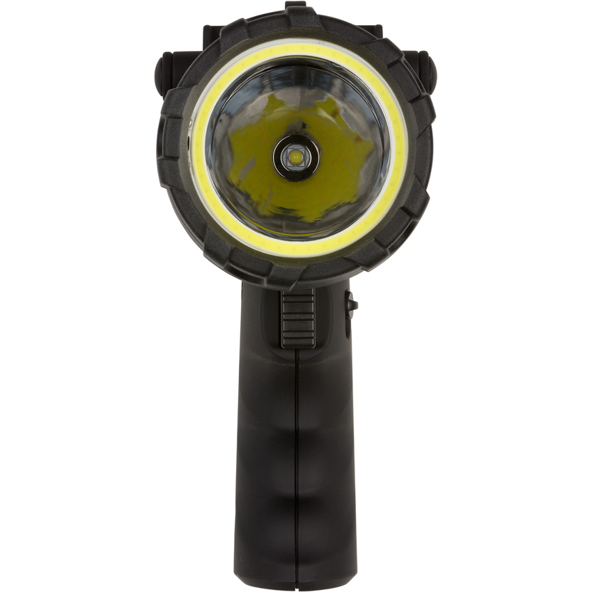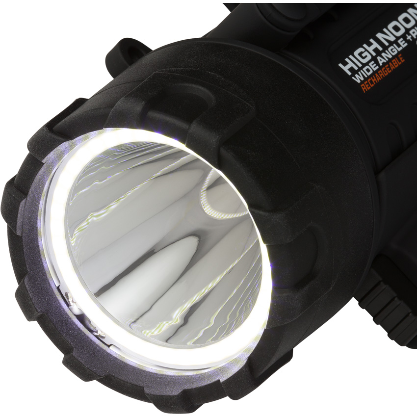 Water resistant. Impact resistant. Rechargeable. Lanyard. Strobe. Weight: 16oz. Modes: Long Distance (850 lumens, 1h 15m runtime, 503m beam distance); Wide Angle High (610 lumens, 1h 15m runtime, 37m beam distance); Long Distance plus Wide Angle (1175 lumens, 1h runtime, 443m beam distance); Wide Angle Low (37 lumens, 18h runtime, 9m beam distance). Battery power indicator. Last Light feature remembers the previous beam setting. Ultra intense wide angle and long distance beam. USB cord included. Power bank allows for charging of other devices. Recharges in 5 hours. Height: 6.63″. Requires (1) Lithium battery (included). Color: Black. Boxed with hanging tab.