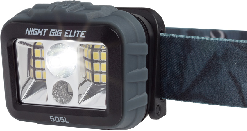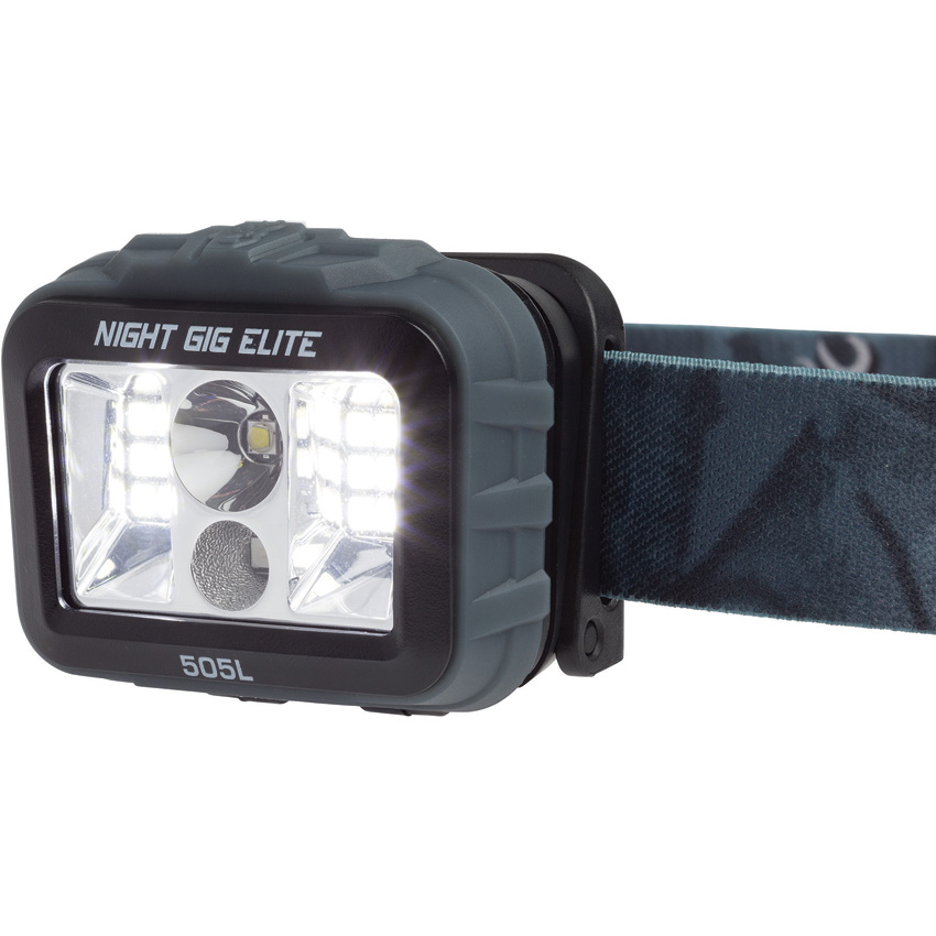 Water resistant. Impact resistant. Strobe. Modes: Wide angle high (430 lumens, 5h runtime); wide angle low (32 lumens, 24h runtime); long distance high (300 lumens, 5h runtime); wide angle plus long distance (505 lumens, 2h runtime); green. Beam distance: 14-125yds. Electronic lock-out mode to prevent accidental activation. Last Light feature remembers the previous beam setting. Blue and gray adjustable nylon headband. Requires (3) AAA batteries (included). Polymer construction. Color: Black. Clam packed.