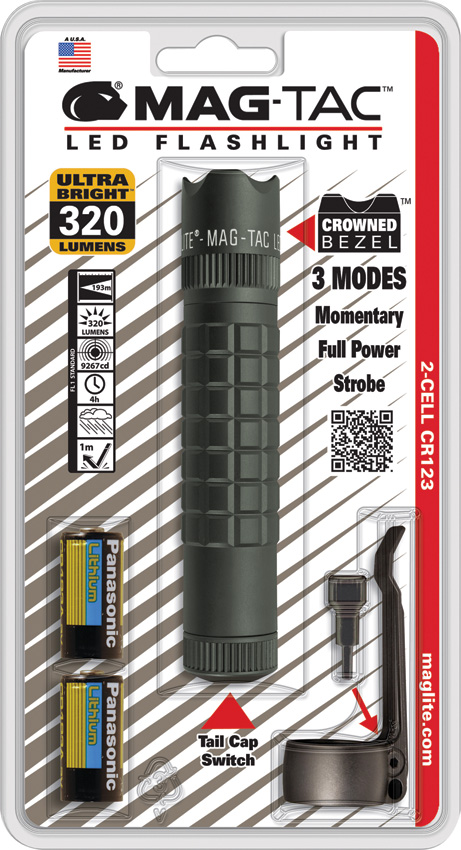5 1/8″ overall. Grooved aircraft grade aluminum body with anodized finish, crowned bezel, and tail cap push-button switch. Water resistant up to 1m. Three modes: momentary, on, and strobe. Ultra Bright white LED with up to 320 lumen output. Visible up to 193m. Requires two CR123 batteries (included). Up to 4 hour run time on high and up to 17 hour run time on low. Hang packaged.