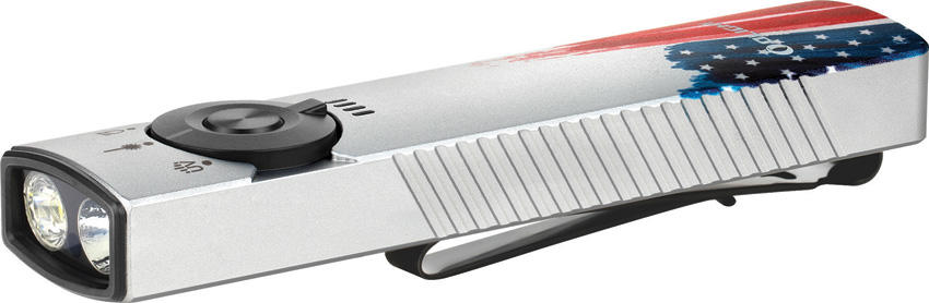 Dimensions: 4.72″ x 0.63″ x 1.06″. Water resistant. Impact resistant. Rechargeable. Cool white LED. Green beam. UV light. Modes: Turbo (1300-420 lumens, 4+126m runtime); High (420-100 lumens, 135+12m runtime); Medium (100 lumens, 9h 45m runtime); Low (15 lumens, 55h runtime); Moon (1 lumen, 11 days runtime). MCC1A magnetic USB charging. 102m beam distance. Color: Stars and stripes. Requires (1) Lithium battery (included). Aluminum construction. Boxed.