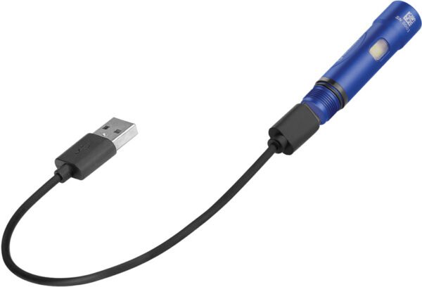 5.75″ overall. Rechargeable. Clip. Can be divided into two functionally independent parts, a pen and flashlight. L-type bolt action. Light modes: High (120 lumens, 20m runtime); Medium (60 lumens, 50m runitme); Low (20 lumens, 2h20m runtime); Moon (5 lumens, 10h runtime). Includes: USB charging cable and ink refill. Requires (1) Lithium battery (included). Color: Blue. Boxed.