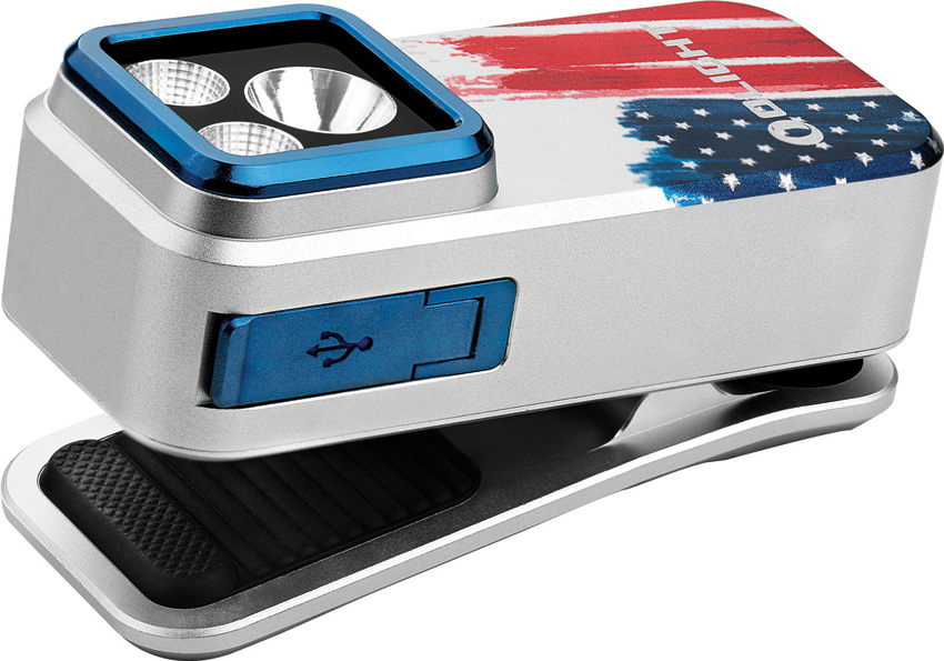 Dimensions: 2.25″ x 1.1″. SOS strobe. Strobe. Water resistant. Impact resistant. Clip. Rechargeable. Side switch operation. White and red LEDs. USB-C charging. 120m beam distance. Modes: Floodlight-Turbo (500-300-100 lumens, 1+50+30m runtime); High (300-180-100 lumens, 1+100+10m runtime); Medium (100 lumens, 3.5h runtime); Low (10 lumens, 27h runtime); Moon (1 lumen, 144h runtime); Spotlight-Turbo (380-240-85 lumens, 1+50+30m runtime); High (240-150-85 lumens, 1+100+10m runtime); Medium (85 lumens, 3.5h runtime); Low (9 lumens, 27h runtime); Moon (1 lumen, 144h runtime); Red (40 lumens). Glass lens. Requires (1) Lithium battery (included). Aluminum construction. Color: Stars and stripes. Boxed.