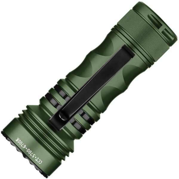 3.43″ overall. Clip. Impact resistant. Water resistant. Rechargeable. Modes: Turbo (1200-600-120 lumens, 3+41+25m runtime); High (600-120 lumens, 50+25m runtime); Medium (120 lumens, 5h 20m runtime); Low (15 lumens, 33h 30m runtime); Moonlight (2 lumens, 12 day runtime). 365nm UV light. USB magnetic charging cable. Cool white and neutral white LED. Requires (1) 18650 battery (included). Aluminum construction. Color: OD Green. Boxed.