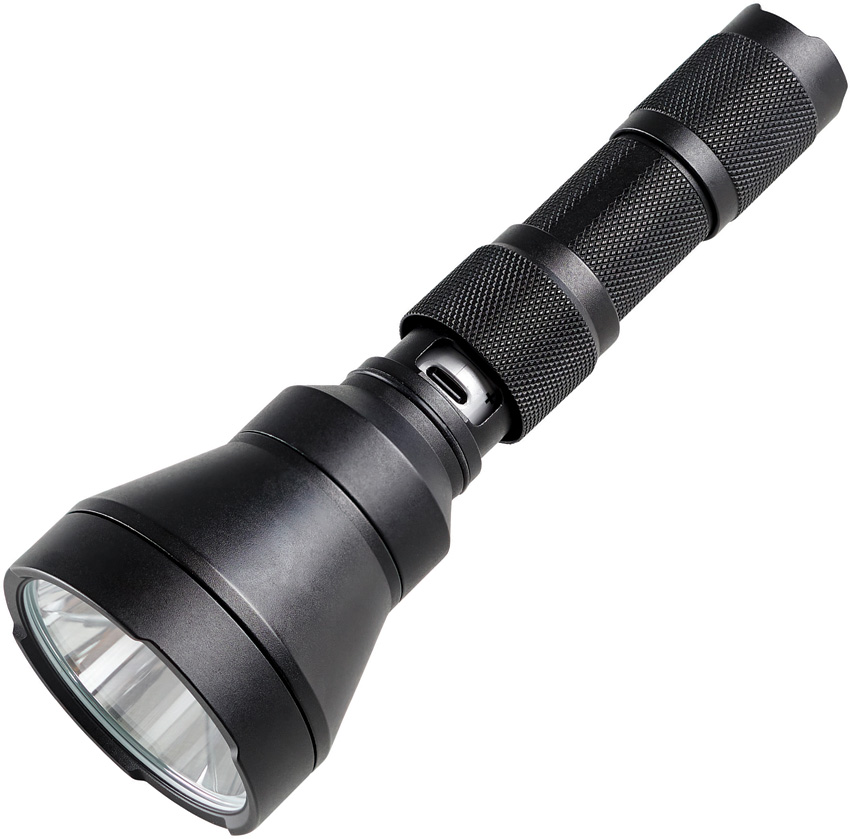 6.63″ overall. Rechargeable. Tailcap switch. Water resistant. Impact resistant. Modes: High (1350 lumens, 2h runtime); Medium (470 lumens, 4h runtime); Low (145 lumens, 15h runtime). 1114m beam distance. Uses (1) SL-834 lithium-ion battery pack (included). Includes holster and USB-C cord. Aluminum construction. Color: Black. Boxed with hanging tab.