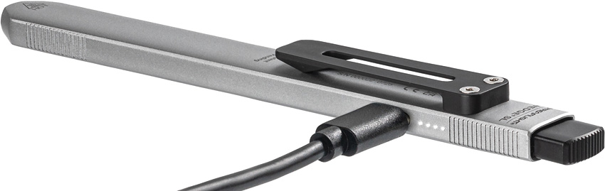 Dimensions: 5.65″” x 0.63″” x .28″”. Rechargeable. Water resistant. Impact resistant. Tailcap switch. Clip. Modes: THRO (500 lumens); Constant-on High (100 lumens, 1.75h runtime); Constant-on Low (50 Lumens, 3.5h runtime). 80m beam distance. Requires (1) Lithium battery (included). Aluminum construction. Color: Silver. Clam packed.