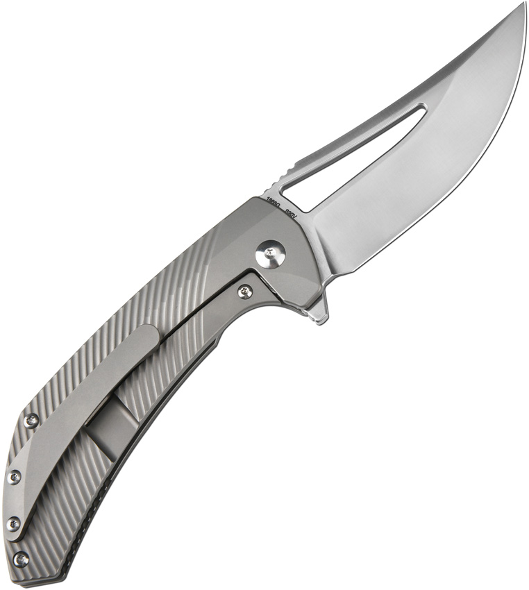 4.63″ (11.76cm) closed. 3.5″ (8.89cm) satin finish S90V steel clip point blade. Gray titanium handle. Extended tang. Thumb pull. Pocket clip. Black nylon zippered storage case. Boxed.
