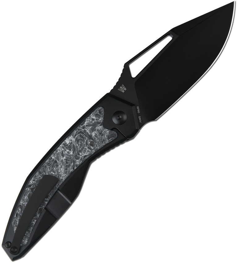 4.88″ (12.4cm) closed. 3.75″ (9.53cm) black PVD coated S90V steel drop point blade. Black titanium handle with Fat carbon fiber inlay. Thumb pull. Pocket clip. Black nylon zippered storage case. Boxed.