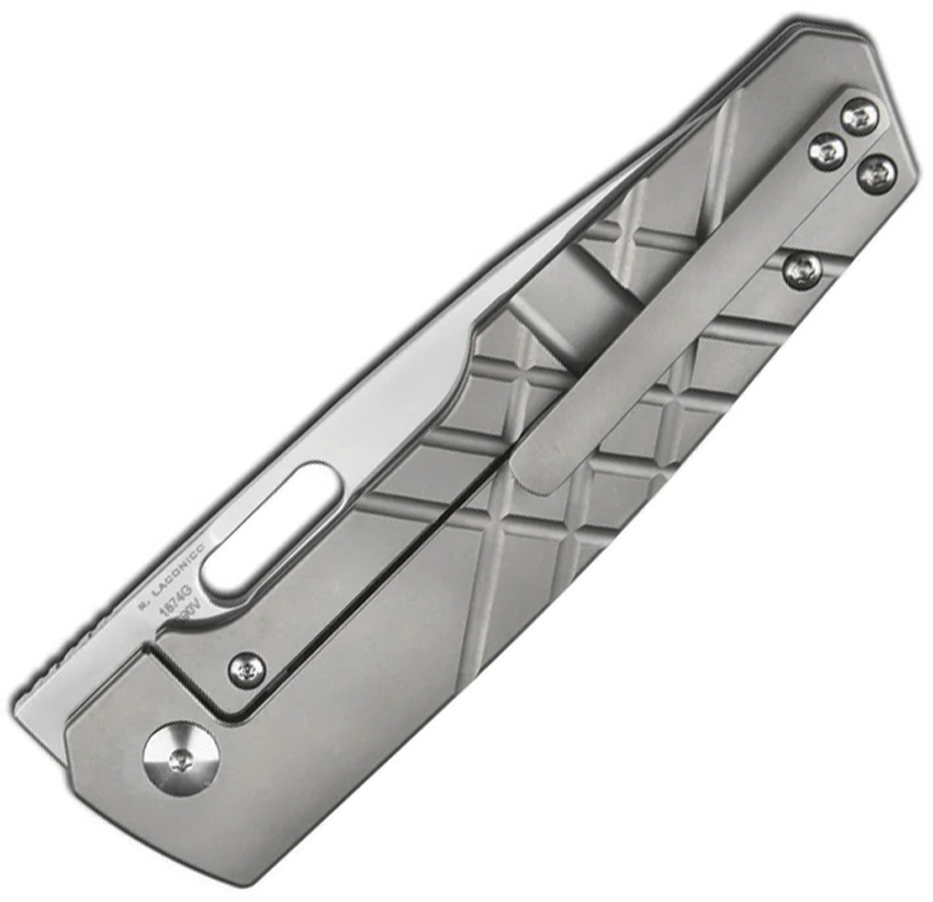 4.5″ (11.43cm) closed. 3.5″ (8.89cm) sand blast finish S90V steel drop point blade. Gray titanium handle. Thumb pull. Pocket clip. Black nylon zippered storage case. Boxed.