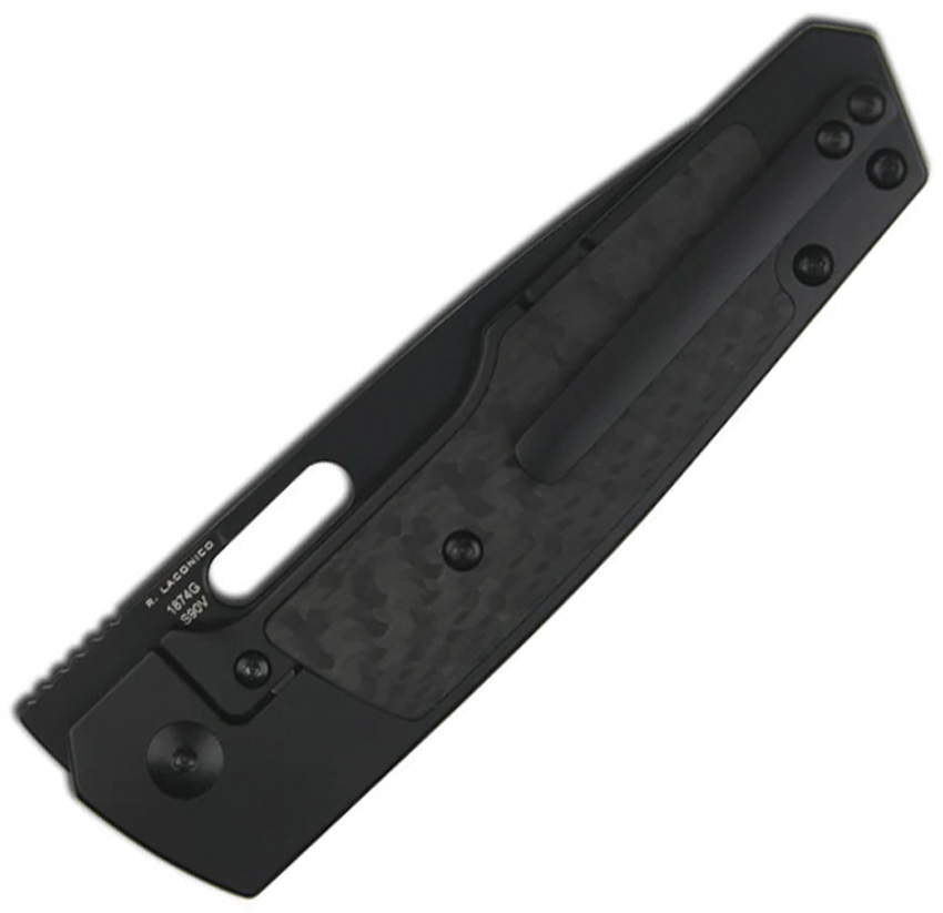 4.5″ (11.43cm) closed. 3.5″ (8.89cm) black finish S90V steel drop point blade. Black titanium handle with carbon fiber inlay. Thumb pull. Pocket clip. Black nylon zippered storage case. Boxed.