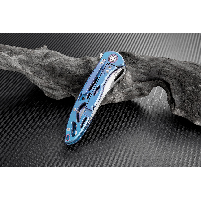 5″ (12.7cm) closed. 3.75″ (9.53cm) satin finish S35VN stainless blade. Blue titanium handle. Extended tang. Thumb pull. Pocket clip. Lanyard hole. Black nylon zippered storage case. Boxed.