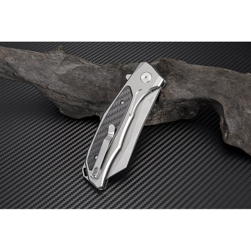 5″ closed. 3.75″ stonewash finish D2 tool steel modified tanto blade. Gray aluminum handle with carbon fiber inlay. Extended tang. Lanyard hole. Pocket clip. Boxed.
