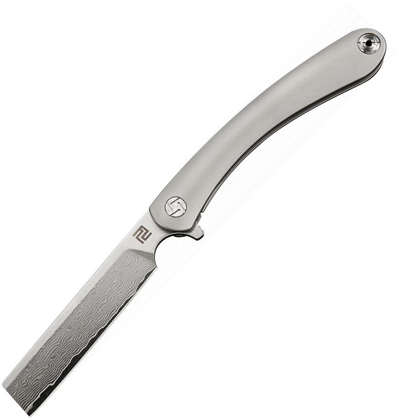 5″ closed. 3.5″ Damascus steel blade. Gray titanium handle. Extended tang. Lanyard hole. Pocket clip. Metal tin. Black nylon zippered storage case. Boxed.