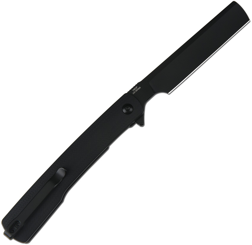 4.5″ (11.43cm) closed. 3.5″ (8.89cm) black PVD coated AR-RPM9 stainless blade. Black G10 handle. Extended tang. Pocket clip. Razor blade. Boxed.