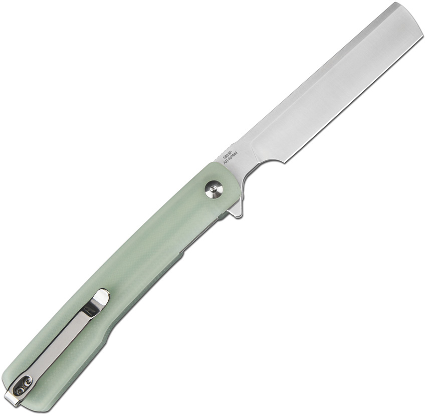4.5″ (11.43cm) closed. 3.5″ (8.89cm) satin finish AR-RPM9 stainless blade. Jade G10 handle. Extended tang. Pocket clip. Razor blade. Boxed.