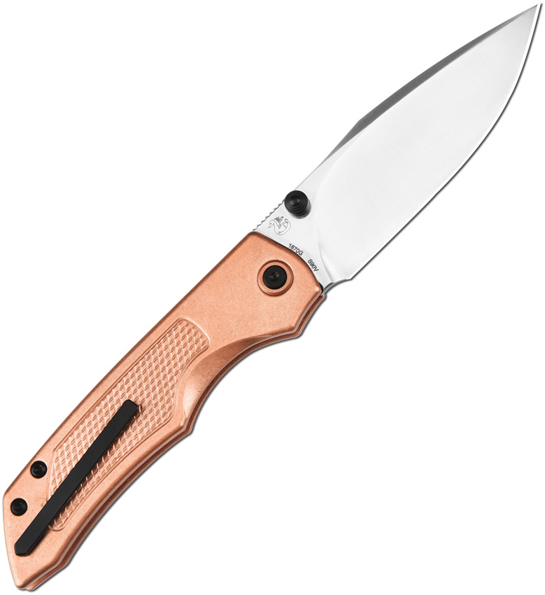 4.25″ (10.8cm) closed. 3.5″ (8.89cm) sand blast finish S90V steel drop point blade. Copper handle. Thumb stud. Pocket clip. Black nylon zippered storage case. Boxed.