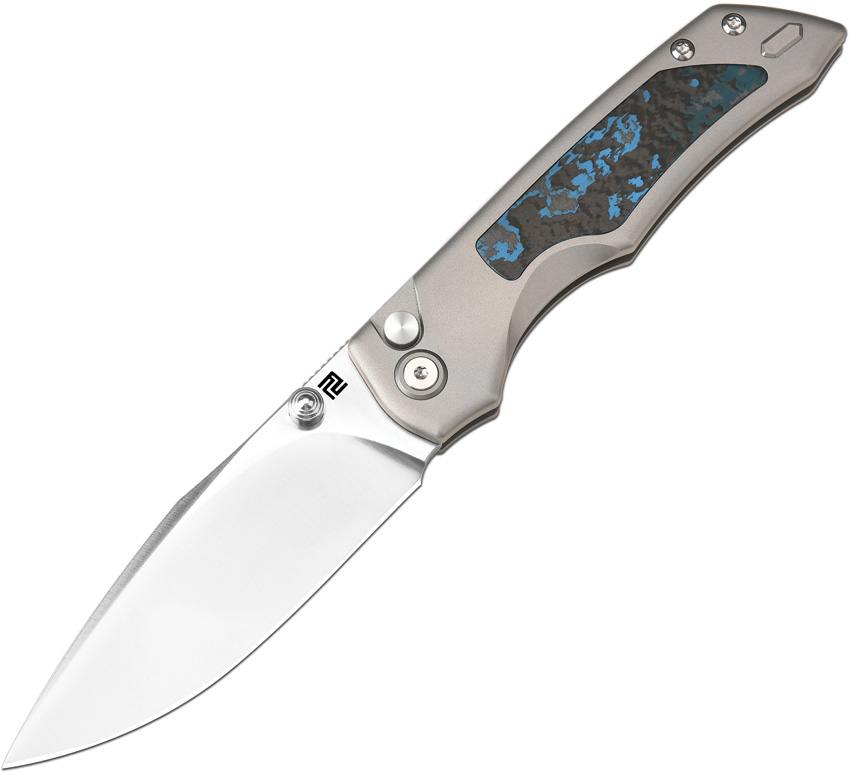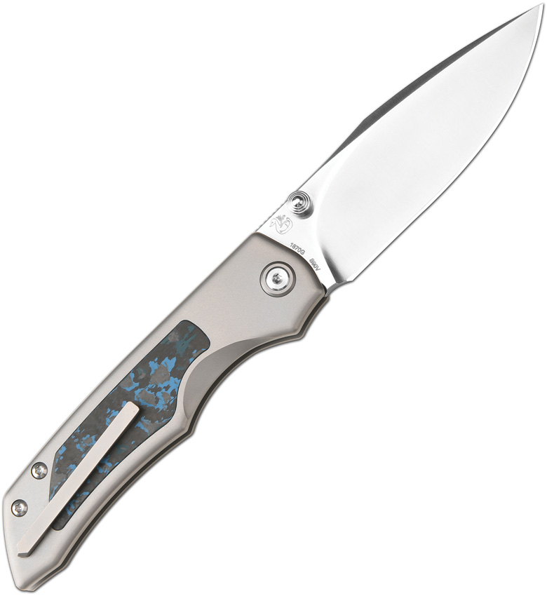4.25″ (10.8cm) closed. 3.5″ (8.89cm) sand blast finish S90V steel drop point blade. Gray titanium handle with Arctic Storm Fat carbon fiber inlay. Thumb stud. Pocket clip. The Sorcerer. Black nylon zippered storage case. Boxed.