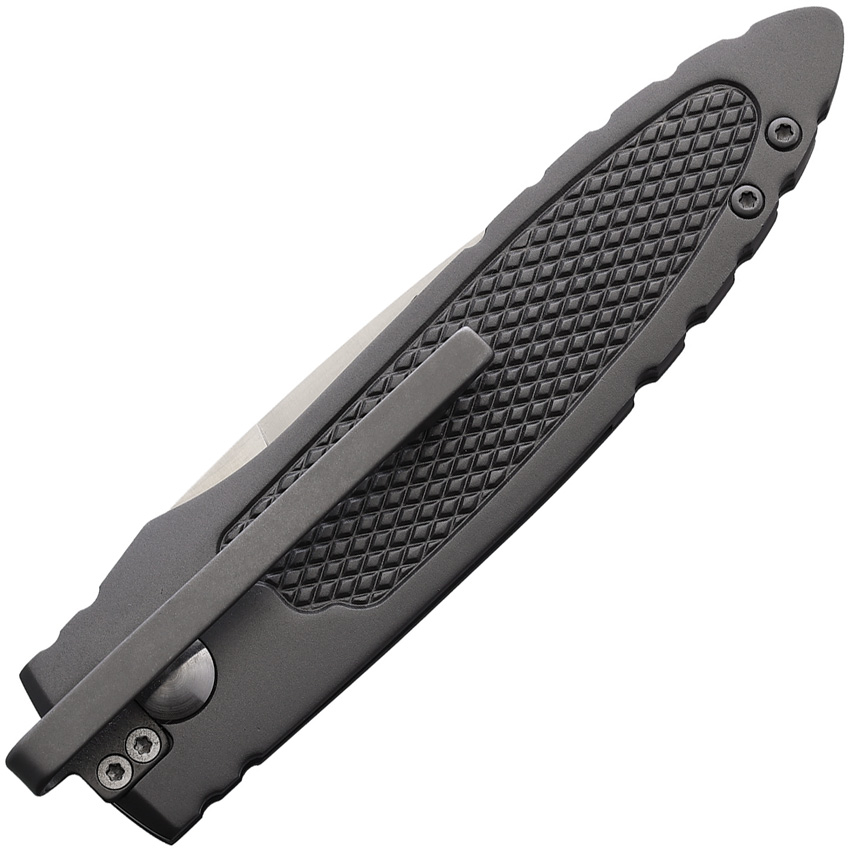 Automatic opening. 4″ (10.16cm) closed. 2.5″ (6.35cm) satin finish 14C28N Sandvik stainless blade. Gray textured stainless handle. Pocket clip. Designed by Steve Jernigan. Boxed.