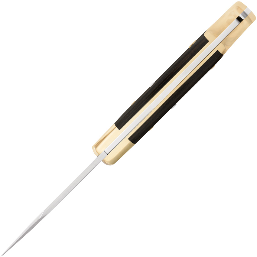 Automatic opening. 4.25″ (10.8cm) closed. 3″ (7.62cm) satin finish 420HC stainless clip point blade. Ebony wood handle. Brass bolster(s). Inlay shield. Black leather belt sheath.