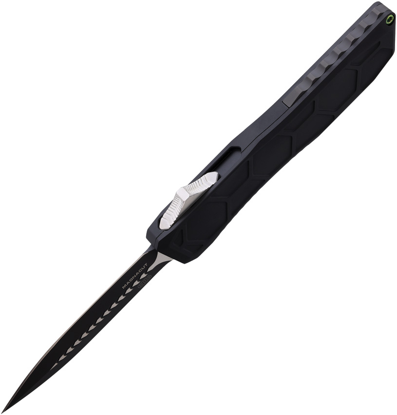 Automatic opening. 5.5″ (13.97cm) closed. 3.75″ (9.53cm) two-tone satin finish double edge MagnaCut steel dagger blade. Black sculpted aluminum handle. Pocket clip. Boxed.