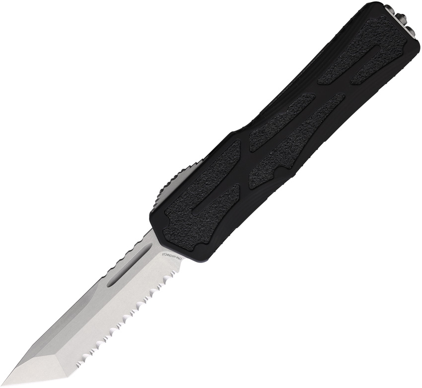 Automatic opening. 5.13″ (13.03cm) closed. 3.5″ (8.89cm) stonewash finish serrated CPM MagnaCut stainless tanto blade. Black aluminum handle with black traction inlay. Glass breaker. Pocket clip. Boxed.