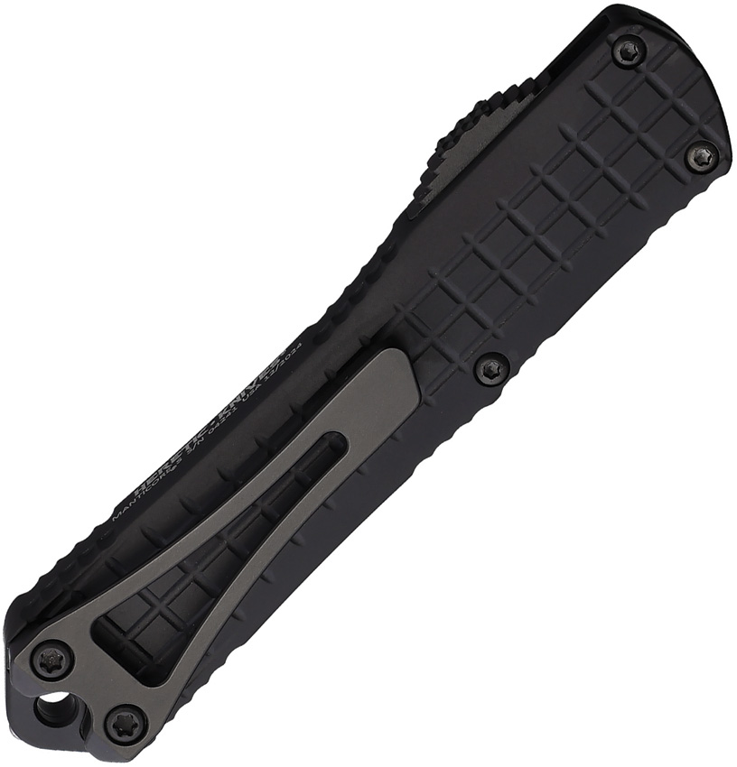 Automatic opening. 3.88″ (9.86cm) closed. 2.63″ (6.68cm) black DLC coated CPM MagnaCut stainless bowie blade. Black grenade pattern aluminum handle. Lanyard hole. Pocket clip. Boxed.