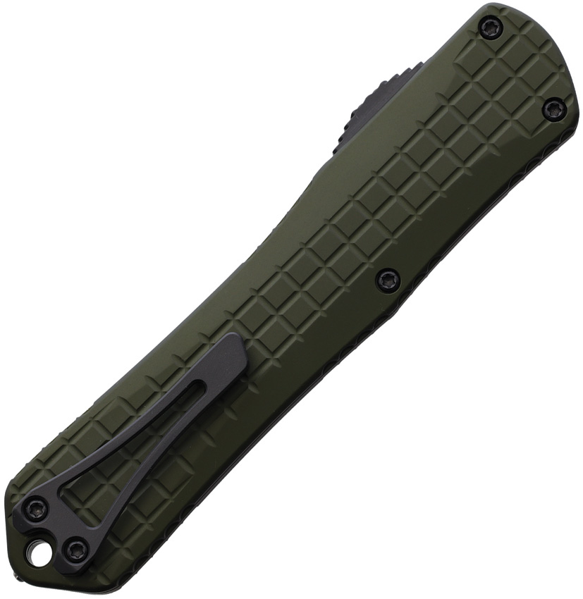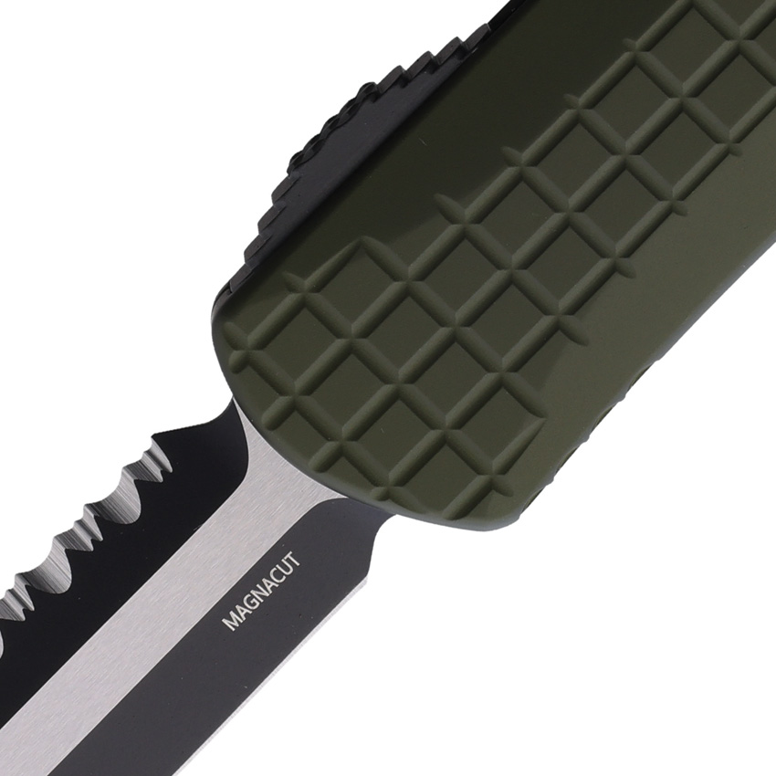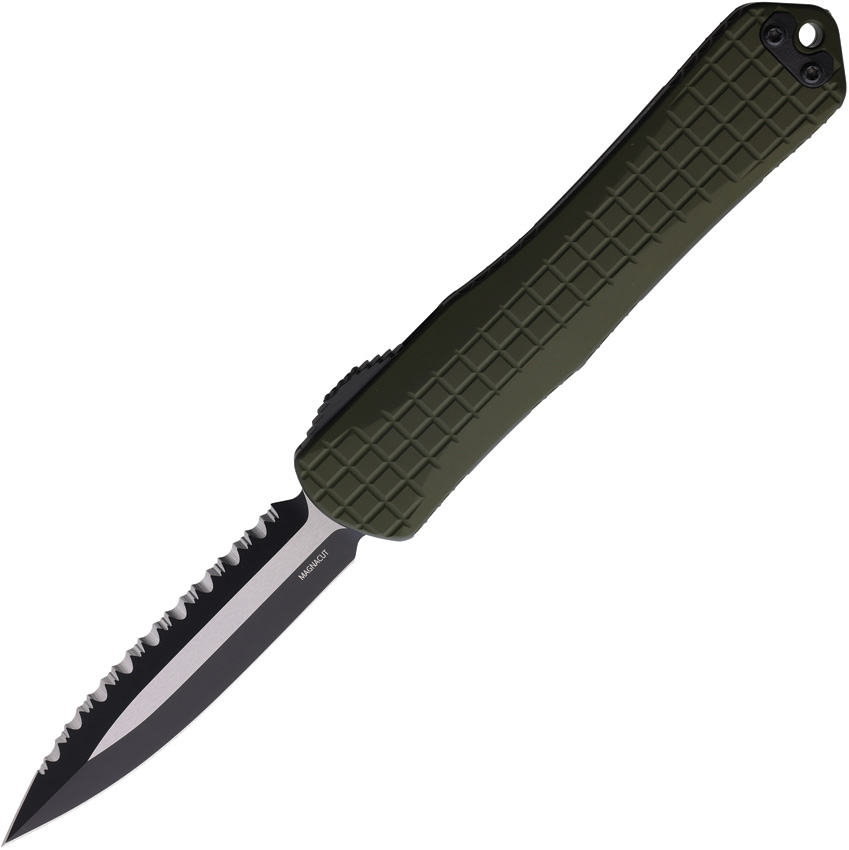 Automatic opening. 5.5″ (13.97cm) closed. 3.75″ (9.53cm) two-tone finish serrated MagnaCut steel spear point blade. OD green aluminum handle. Glass breaker. Lanyard hole. Pocket clip. Frag pattern handle. Double edge blade. Boxed.
