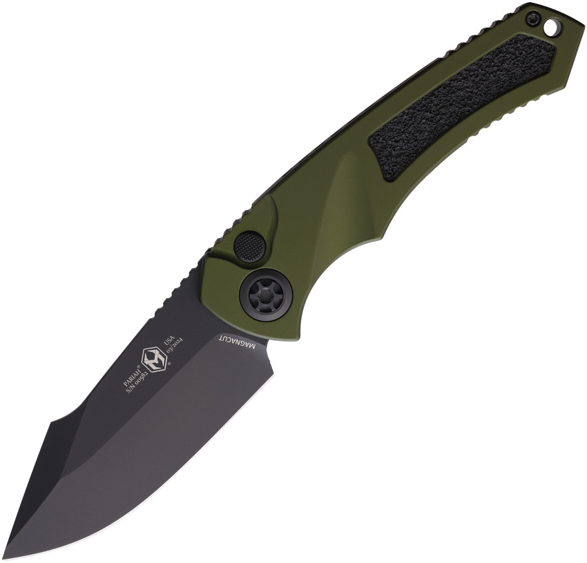 Automatic opening. 5.13″ (13.03cm) closed. 3.75″ (9.53cm) black DLC coated CPM MagnaCut stainless drop point blade. OD green aluminum handle with black grip tape inlay. Lanyard hole. Pocket clip. Boxed.