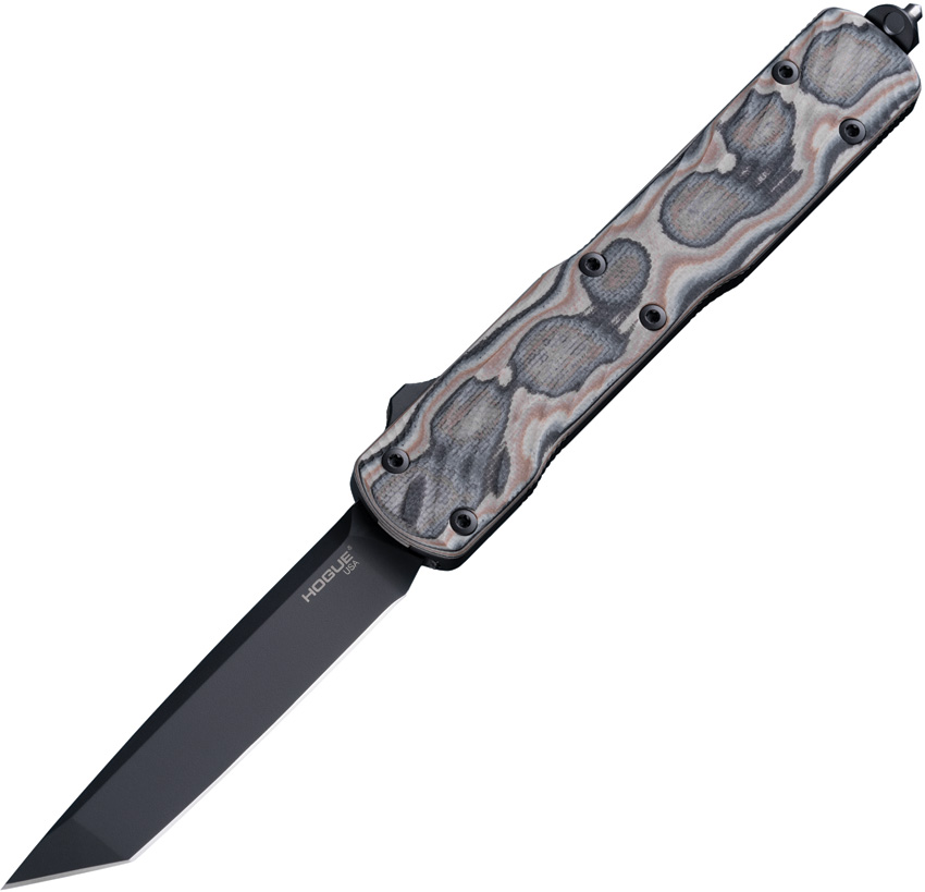Automatic opening. 5″ (12.7cm) closed. 3.38″ (8.59cm) black PVD coated CPM-20CV stainless tanto blade. Black and brown G10 G-Mascus handle with black aluminum back handle. Glass breaker. Lanyard hole. Pocket clip. Ambidextrous trigger deployment and retraction. Boxed.
