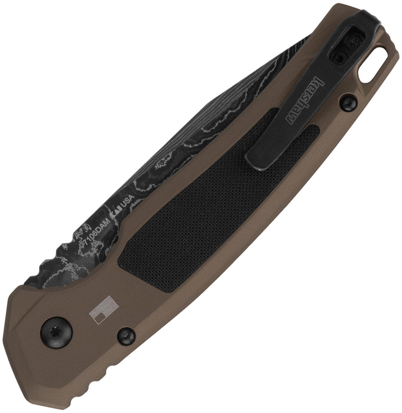 Automatic opening. 5″ (12.7cm) closed. 3.5″ (8.89cm) Damascus steel drop point blade. Bronze aluminum handle with black G10 insert. Lanyard hole. Pocket clip. Boxed.