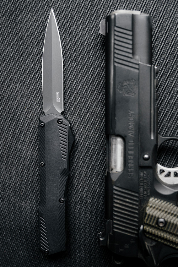 Automatic opening. 4.88″ (12.4cm) closed. 3.25″ (8.26cm) black PVD coated double edge CPM MagnaCut stainless spear point blade. Black anodized aluminum handle. Pocket clip. Designed by Matt Diskin. Boxed.