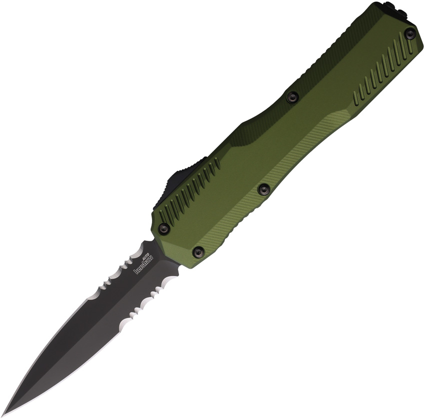 Automatic opening. 4.88″ (12.4cm) closed. 3.25″ (8.26cm) black oxide coated partially serrated CPM MagnaCut stainless dagger blade. OD green aluminum handle. Pocket clip. Double edge blade. Boxed.