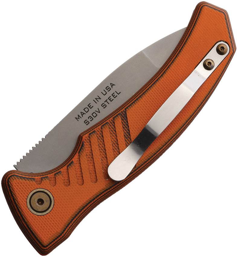 Automatic opening. 4.25″ (10.8cm) closed. 3.25″ (8.26cm) bead blast finish S30V stainless blade. Black and orange G10 handle. Pocket clip. Boxed.