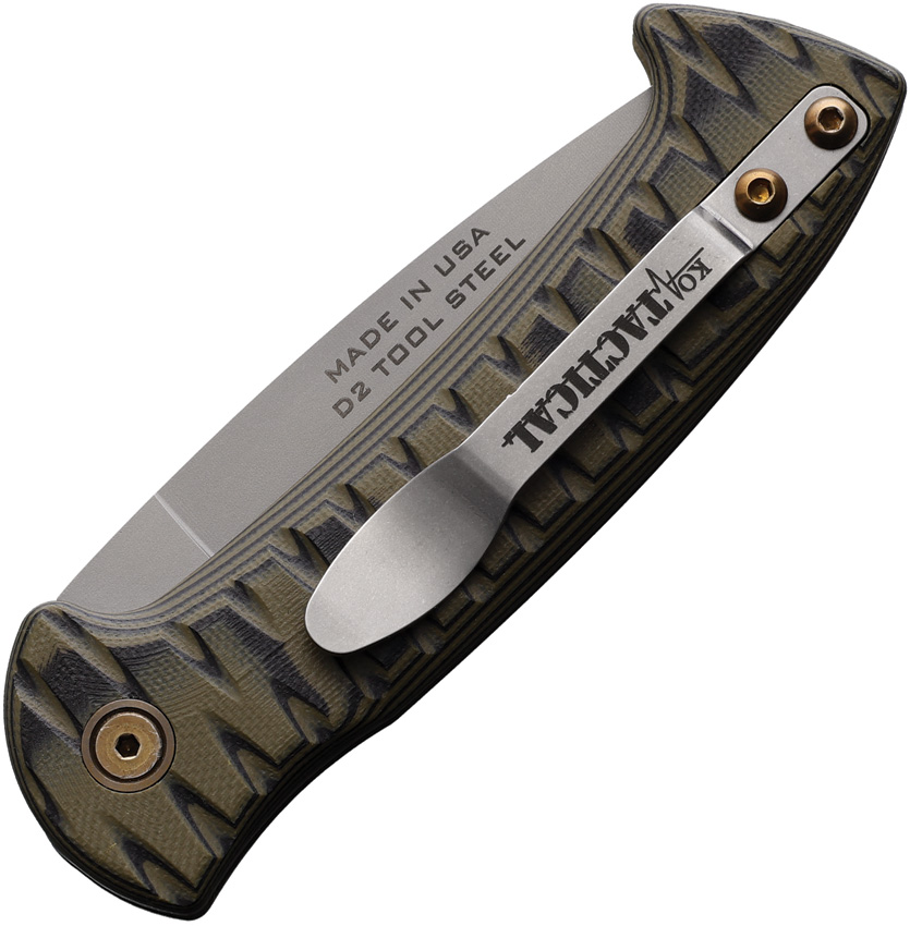 Automatic opening. 4.75″ (12.07cm) closed. 3.5″ (8.89cm) bead blast finish D2 tool steel blade. Black and OD green sculpted G10 handle. Pocket clip. Manual safety. Boxed.