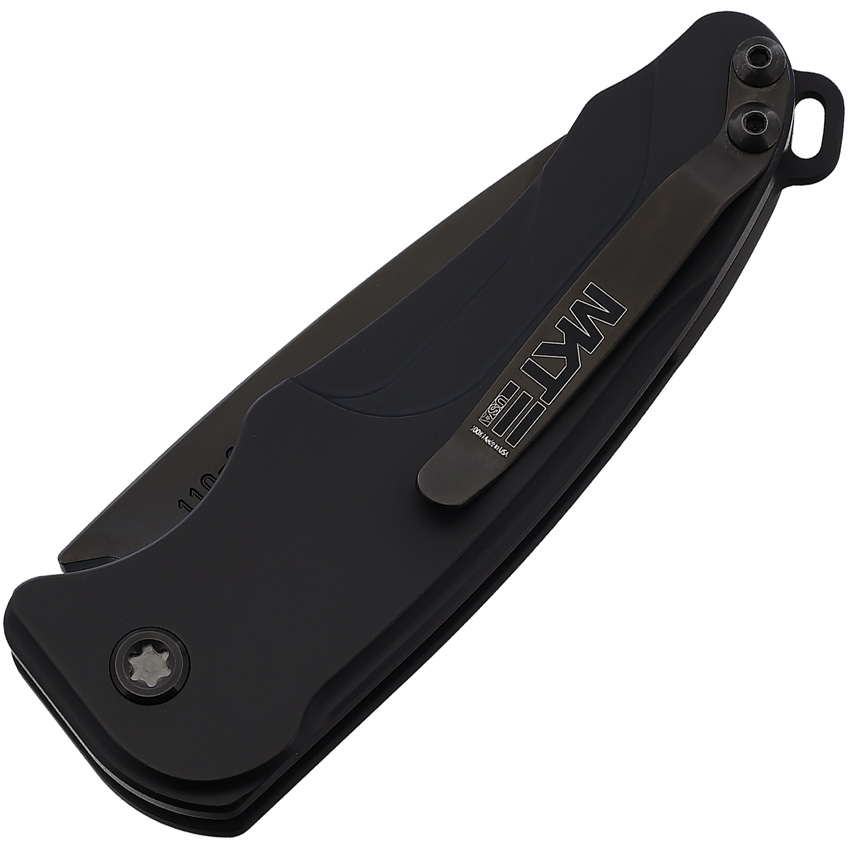 Automatic opening. 4″ (10.16cm) closed. 3″ (7.62cm) black PVD coated S35VN stainless drop point blade. Black anodized aluminum handle. Pocket clip. Lanyard hole. Black nylon zippered storage case. Boxed.
