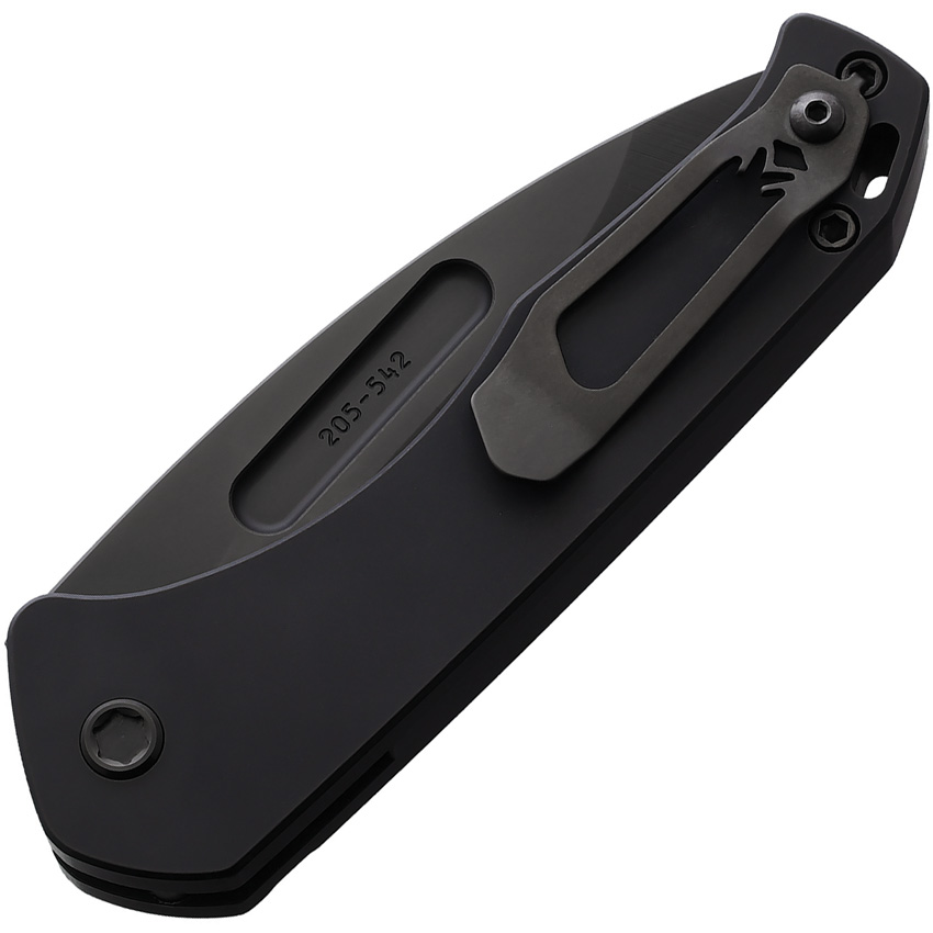 4.38″ (11.13cm) closed. 3.38″ (8.59cm) black PVD coated S35VN stainless drop point blade. Black PVD coated titanium handle. Lanyard hole. Pocket clip. Safety mechanism. Black nylon zippered storage case. Boxed.