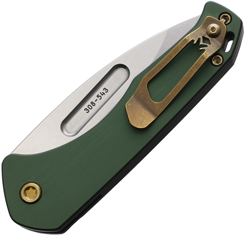 Automatic opening. 4.25″ (10.8cm) closed. 3.25″ (8.26cm) tumbled finish S45VN stainless drop point blade. Green aluminum handle. Lanyard hole. Pocket clip. Manual safety. Black nylon zippered storage case. Boxed.