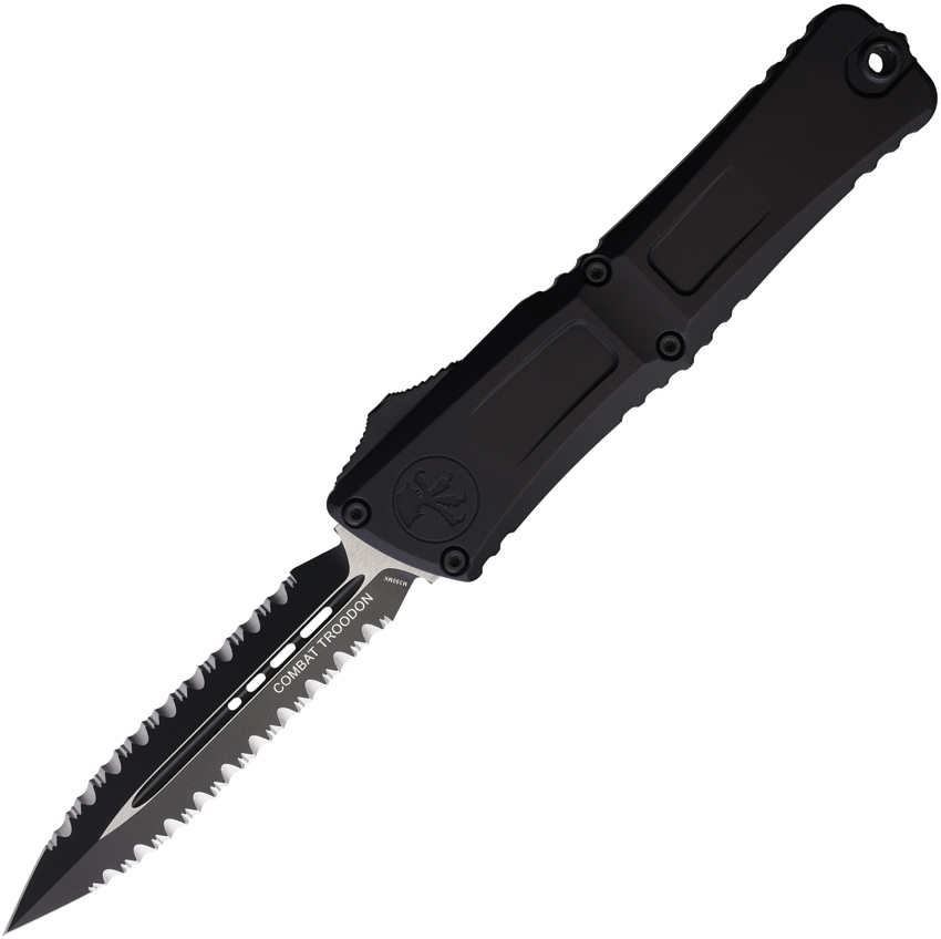 Automatic opening. 5.38″ (13.67cm) closed. 4″ (10.16cm) two-tone finish serrated Bohler M390MK stainless dagger blade. Black aluminum handle. Pocket clip. Lanyard hole. Glass breaker. Boxed.