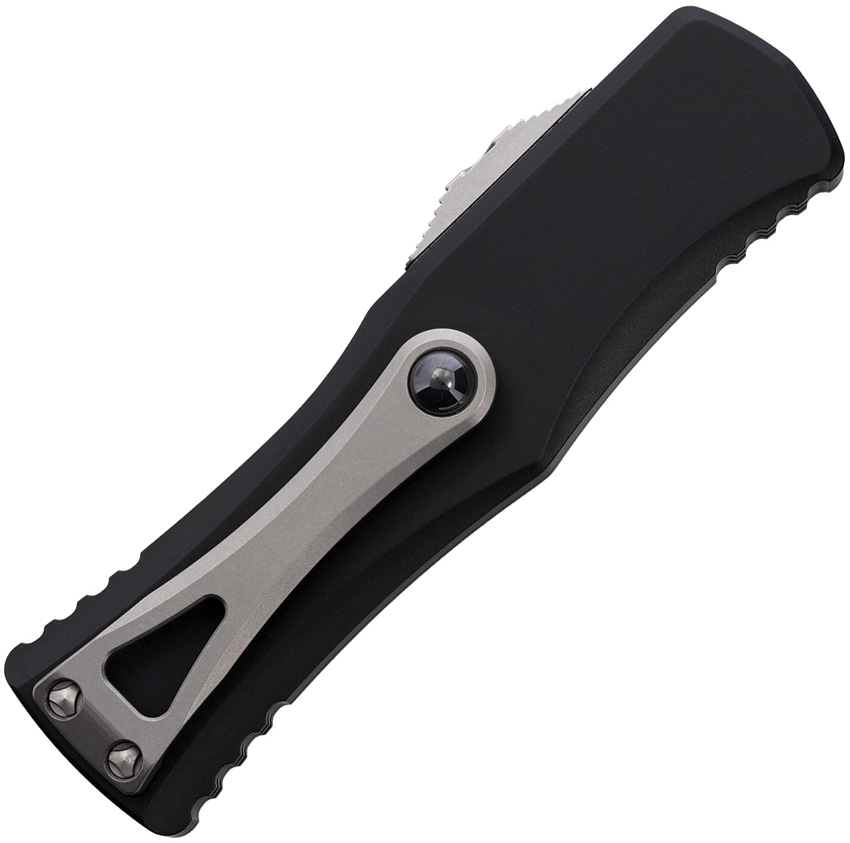 Automatic opening. 4.38″ (11.13cm) closed. 3″ (7.62cm) stonewash finish serrated premium steel dagger blade. Black aluminum handle. Pocket clip. Boxed.