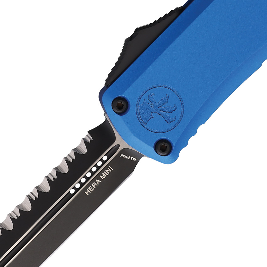 Automatic opening. 4″ (10.16cm) closed. 3″ (7.62cm) two-tone finish serrated Bohler M390MK stainless dagger blade. Blue aluminum handle. Pocket clip. Lanyard hole. Glass breaker. Boxed.