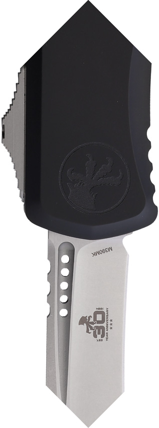 Automatic opening. 5.5″ (13.97cm) closed. 4″ (10.16cm) stonewash finish Bohler M390MK stainless recurve blade. Black aluminum handle. Pocket clip. Lanyard hole. Glass breaker. 30th anniversary edition. Boxed.