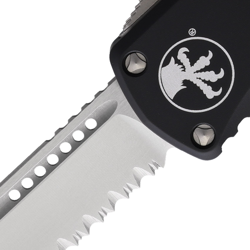 Automatic opening. 4.38″ (11.13cm) closed. 3″ (7.62cm) stonewash finish partially serrated premium steel blade. Black aluminum handle. Pocket clip. Boxed.